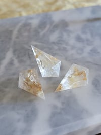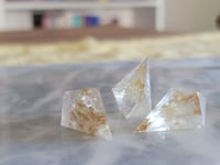 Clear resin filled with white florals and gold foil, inked a soft white.