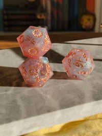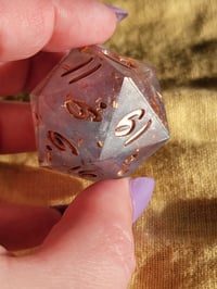 These dice are handmade and will have some minor surface marks from the sanding, inking, and polishing process. Common mold marks will be photographed but will not impact the usability of the dice. Any notable imperfections will be listed below.