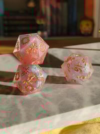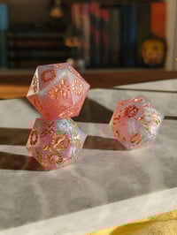 Soft shimmery pink and blue clouds of resin make up the dice with flecks of rose gold foil. The dice are also inked a metallic rose gold.