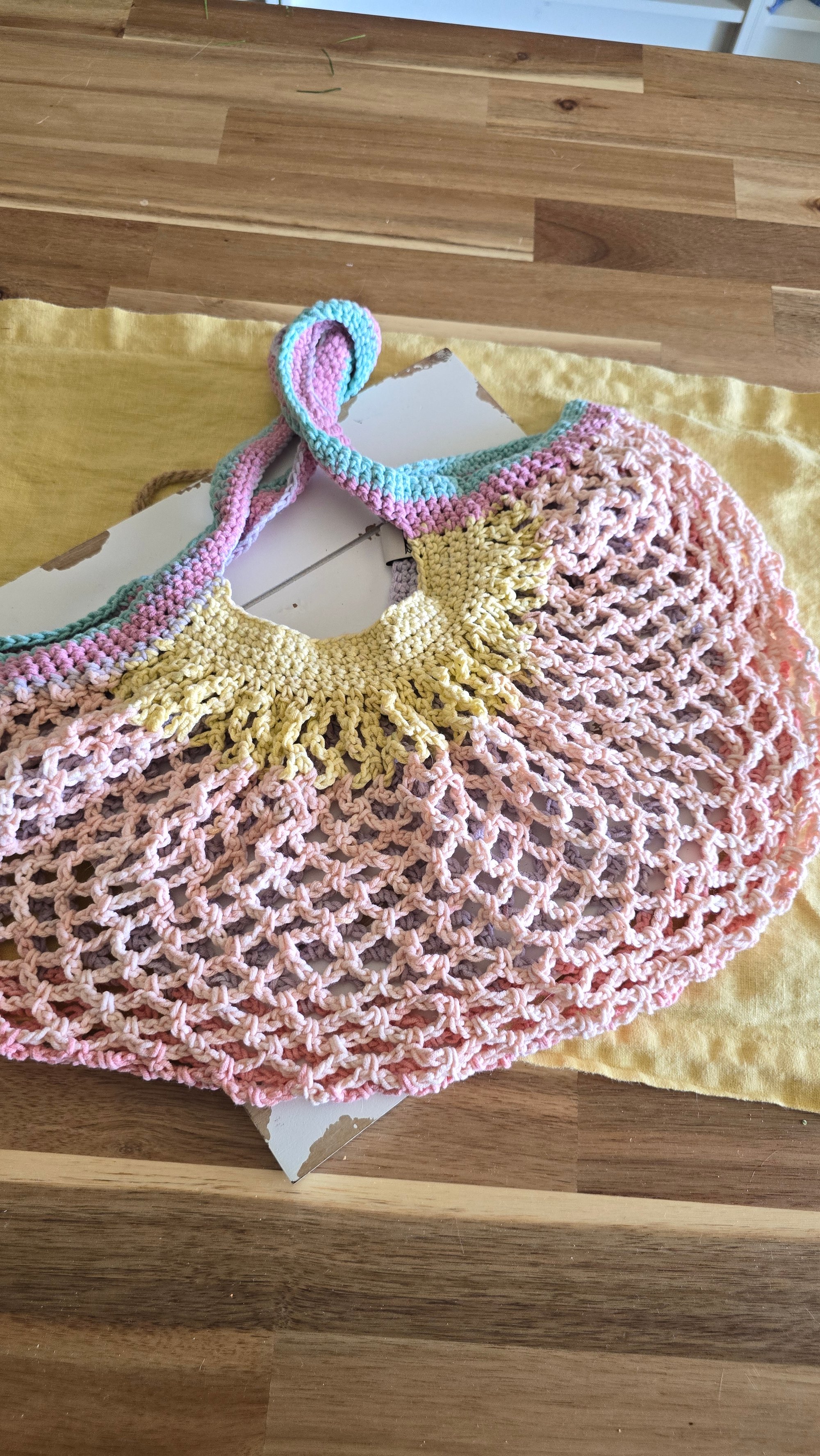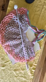 A mesh market bag made of 100% cotton yarn. Please see last photos for approximate measurements but know that there is a lot of stretch in the mesh itself.