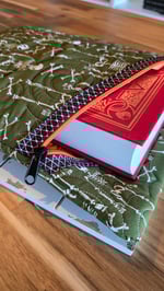 The hemmingway pouch features quilted cotton and a large zipper pocket for storage. The small size is perfect for makeup, pencils. Art supplies, glasses, and other small items while the large size would be great for books, ereaders, tablets, and more.