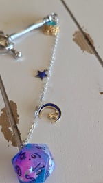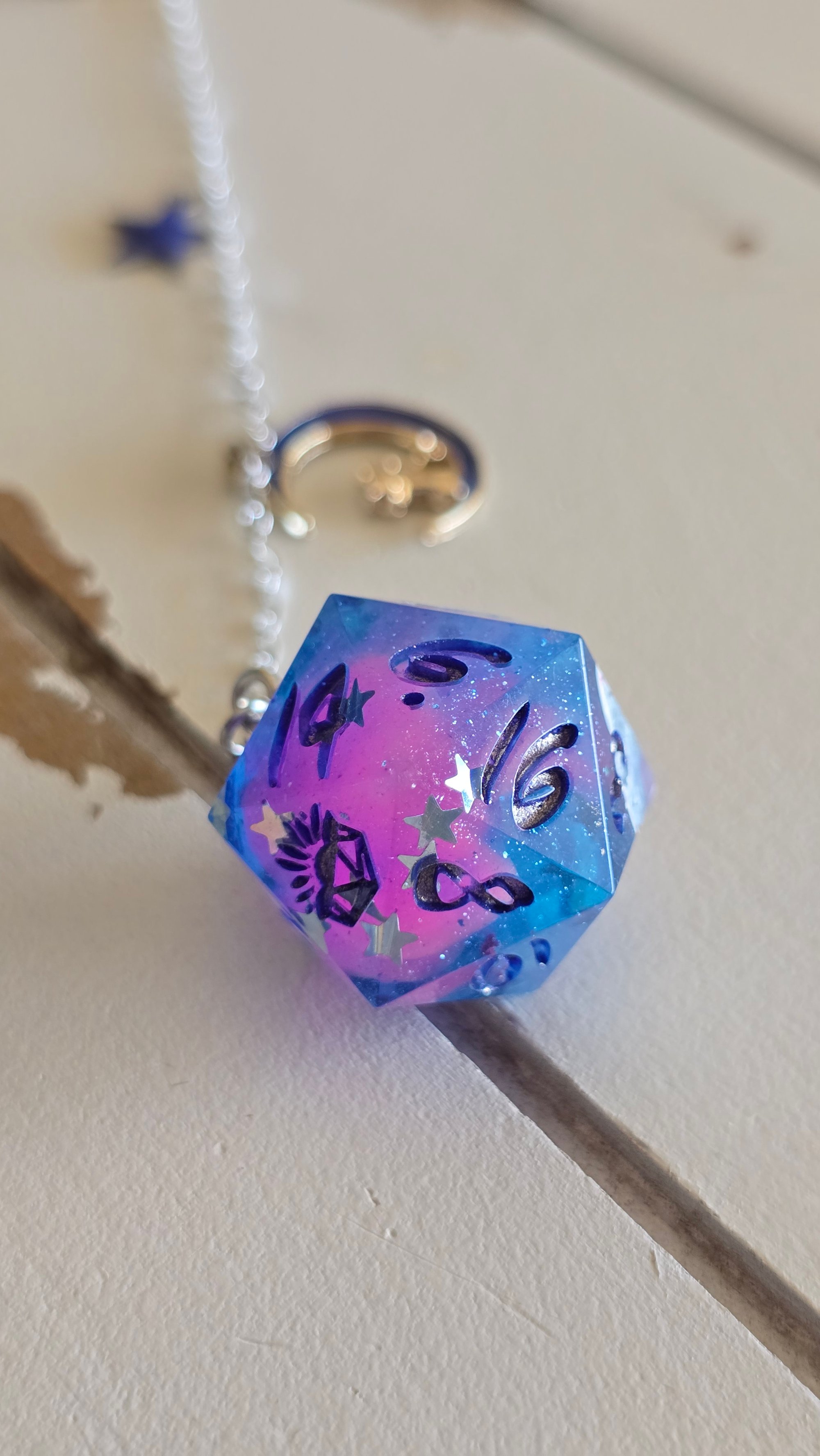 A metal sword hair stick paired with a handmade die.