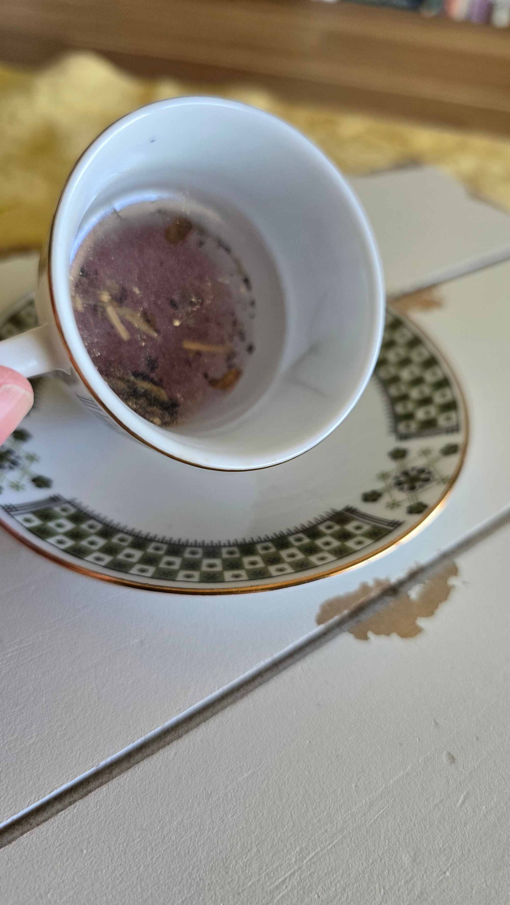 A vintage tea cup with a resin and loose leaf tea surface for rolling dice or holding jewelry/trinkets.