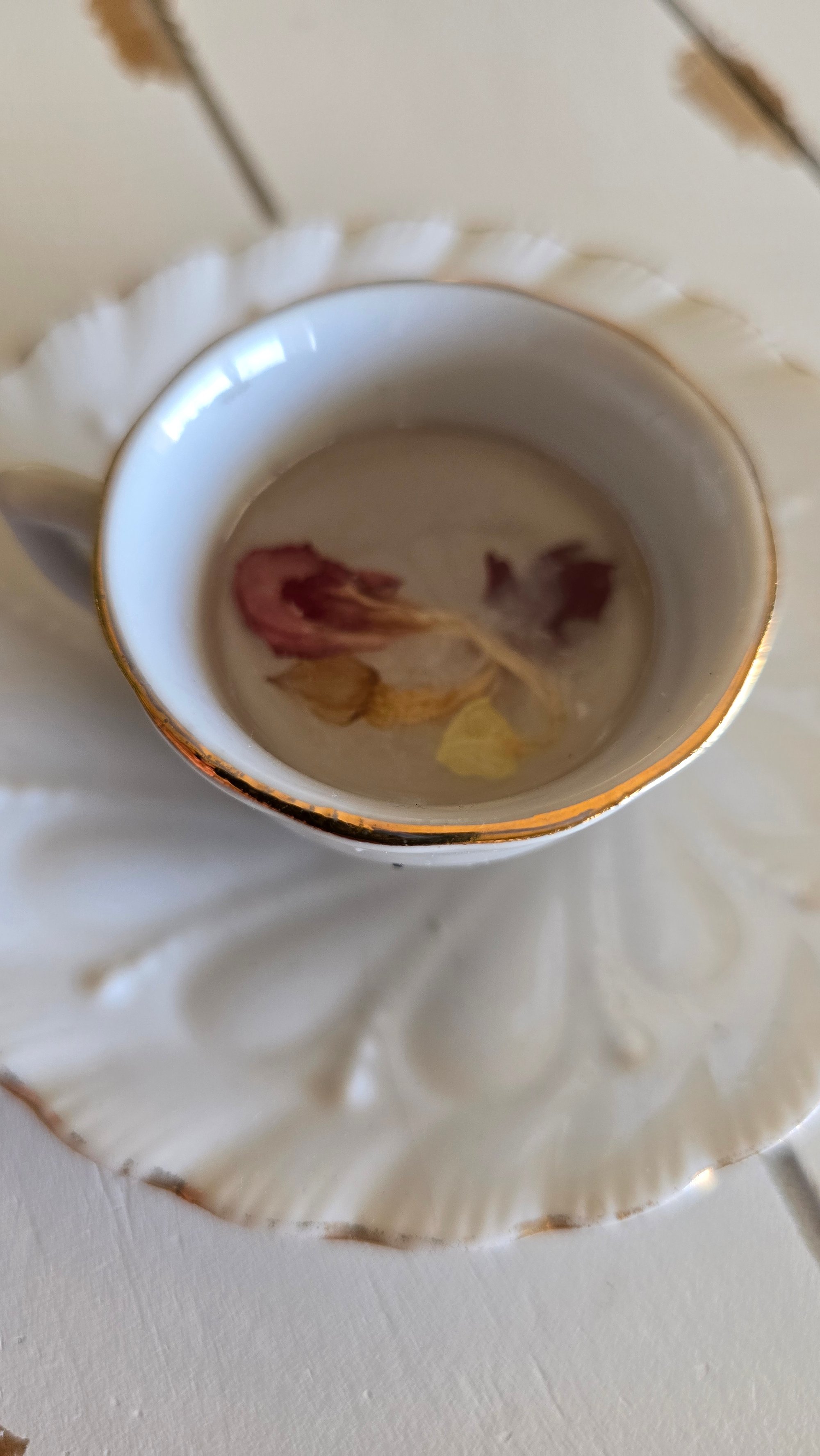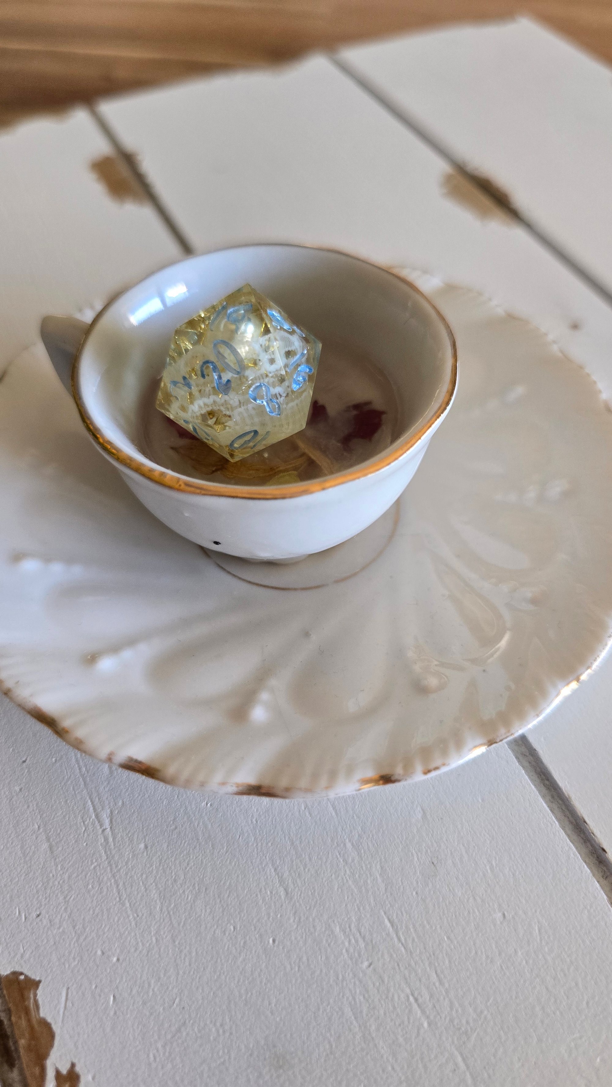A vintage tea cup with a resin and loose leaf tea surface for rolling dice or holding jewelry/trinkets.