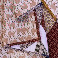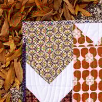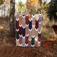 This quilt is approximately 48x60 and features rich autumnal colors with forest friends in an arrow pattern, backed with cute deer. The quilting is a wood grain pattern.
