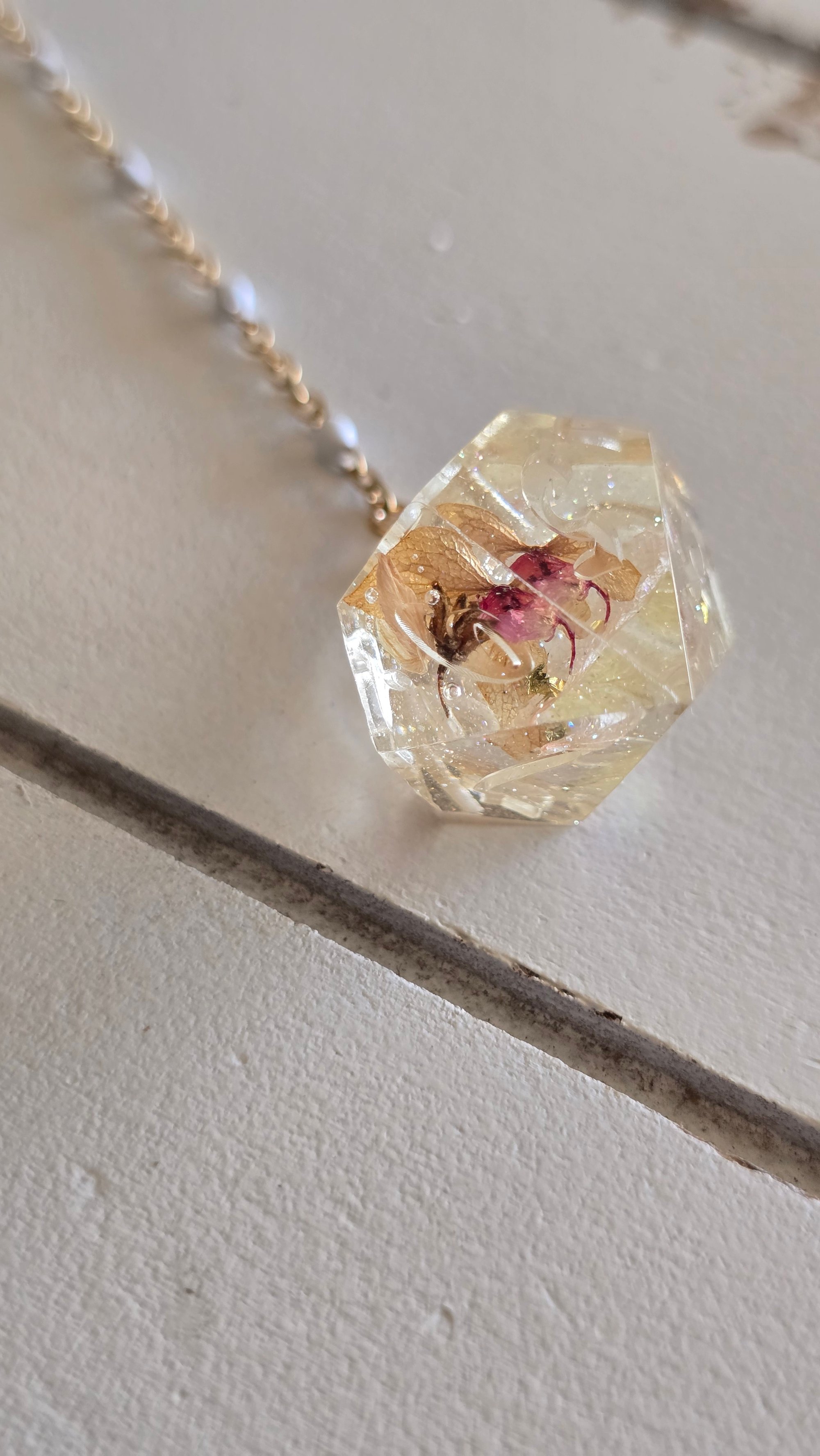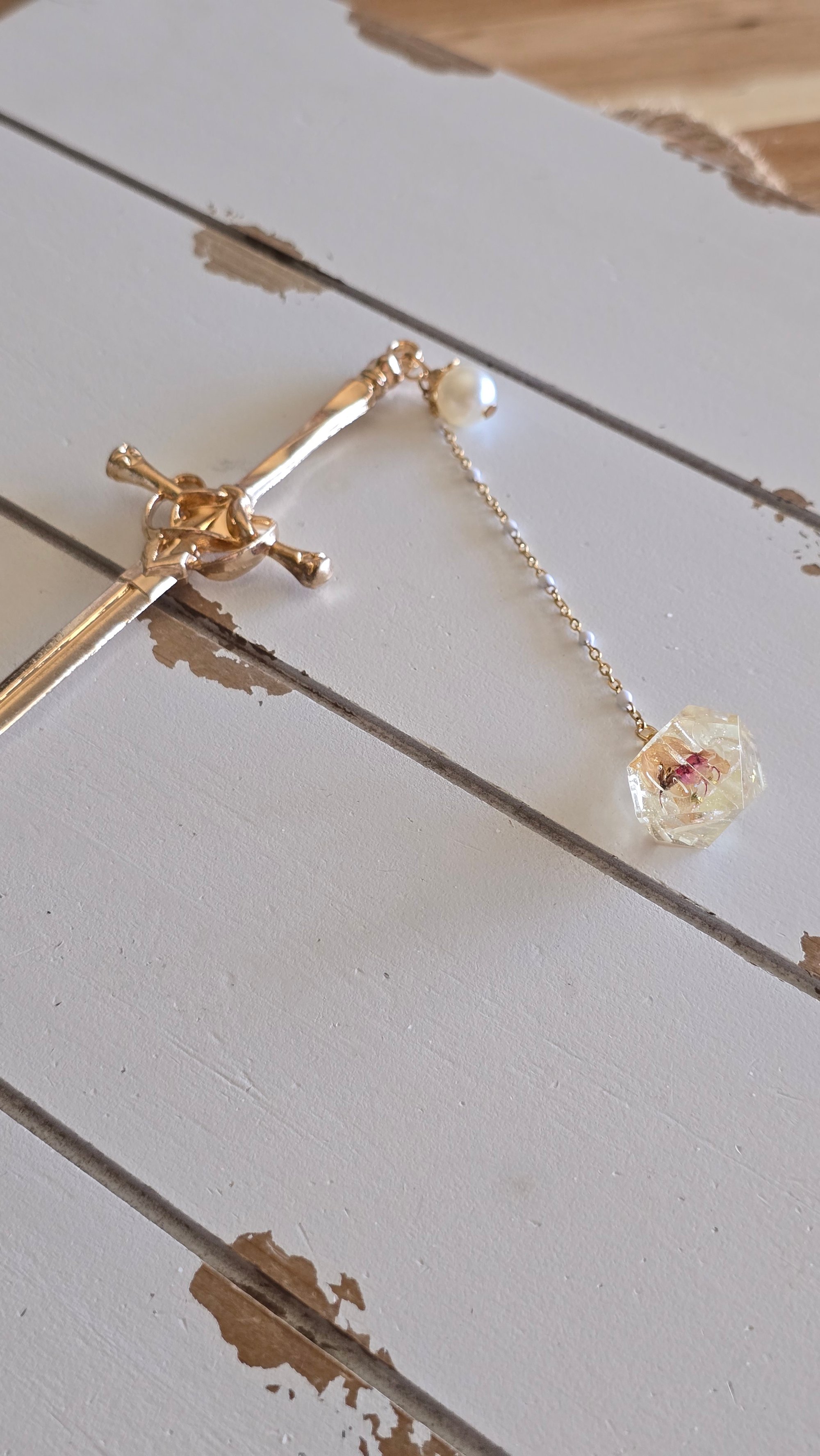 A metal sword hair stick paired with a handmade die.