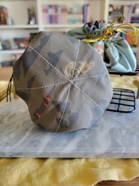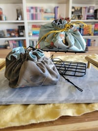 The dice bag is 15 inches in diameter when laid flat and contains 6 pockets. Each pocket can comfortably hold 1-2 sets of dice and the central area can be used as a rolling surface, for mini storage, or for 3-5 additional sets of dice
