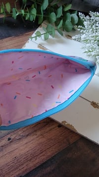 Purple fabrix covered in donuts and doodles paired with a pink sprinkle fabric.