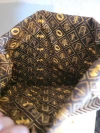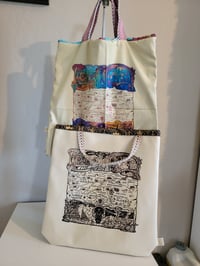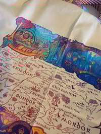 This tote bag measures approximately 16x16 inches and features a gorgeous map of middle earth with decorative art of different locations framing it. Vinyl front versions of the tote bag features the design in linework while canvas front versions feature full color artwork.