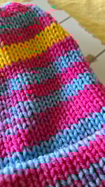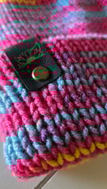 Beanie is made with a cotton/acrylic yarn blend and is knit in the round and double layered for warmth. Please note that because of the handmade nature of this product, color placement may not be exact and item may have some irregularities in the knit pattern.