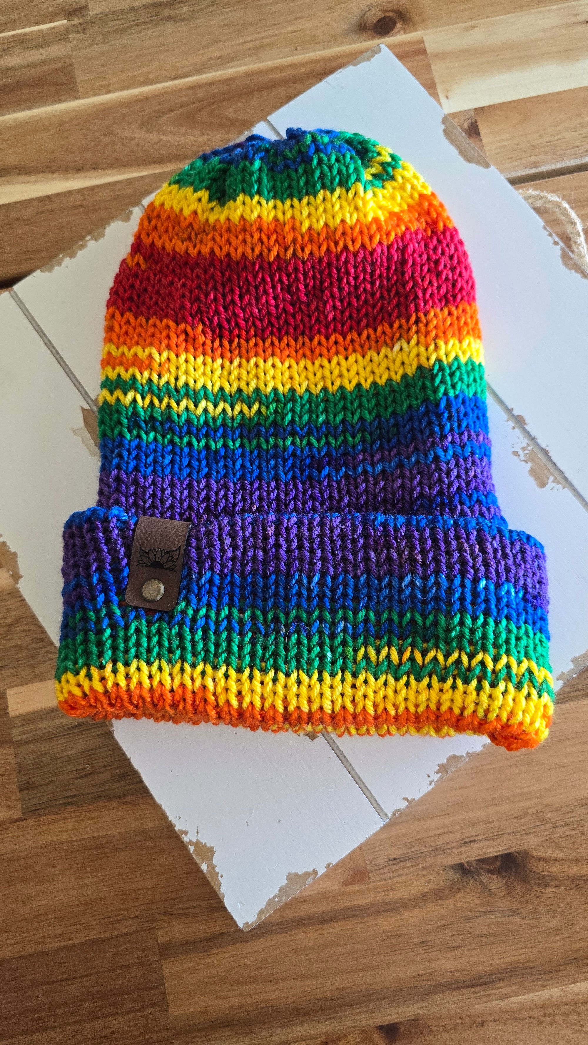 Beanie is made with a cotton/acrylic yarn blend and is knit in the round and double layered for warmth. Please note that because of the handmade nature of this product, color placement may not be exact and item may have some irregularities in the knit pattern.