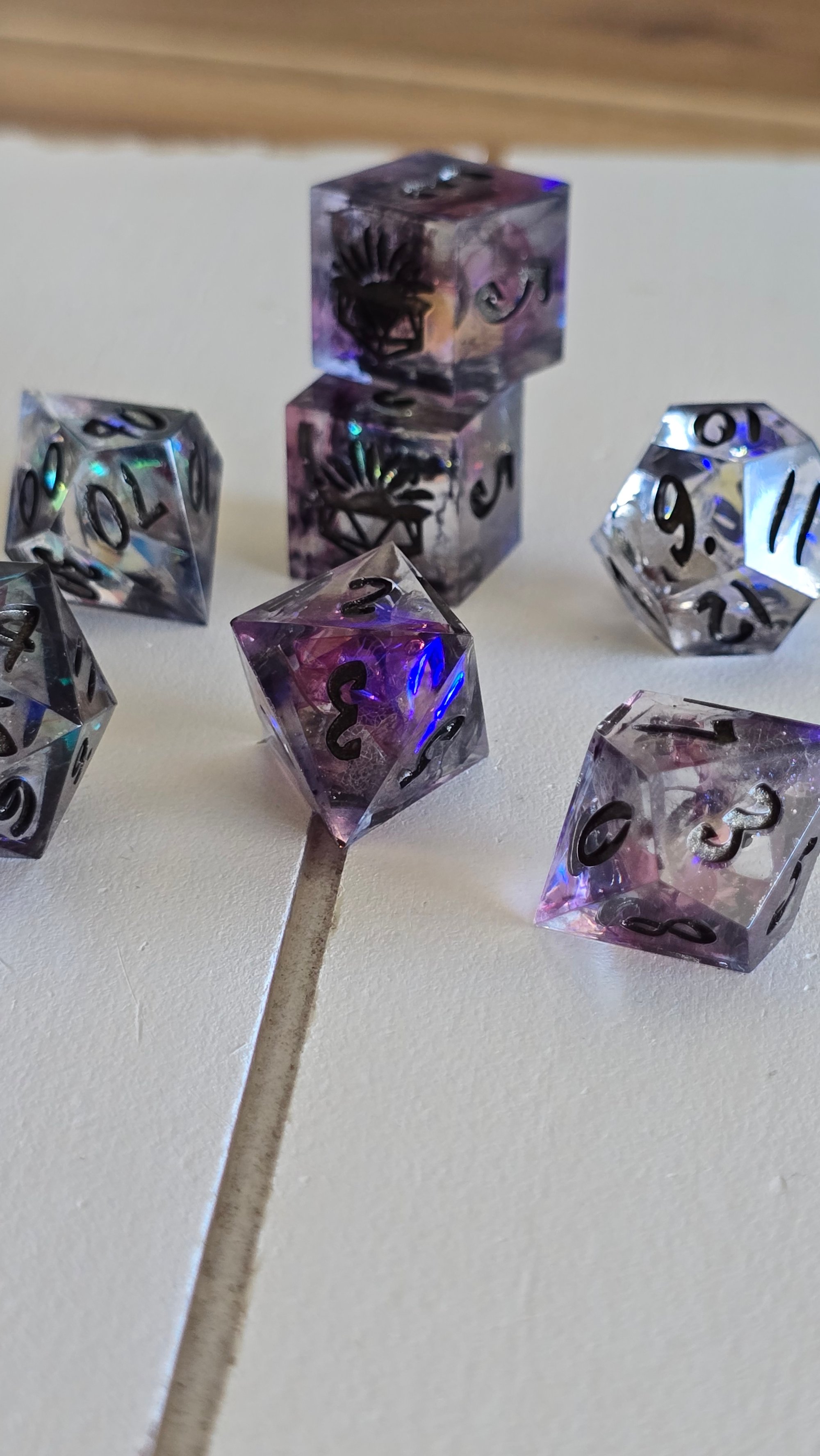 An 8 piece dice set with purple florals, flashes of mylar, and swirls of black ink.