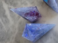 Grayish purple resin, flashes of purple mylar, and and clouds of white and color shift are inked a metallic maroon or uninked.