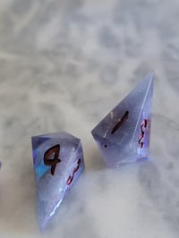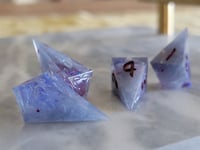 These dice are handmade and will have some minor surface marks from the sanding, inking, and polishing process. Common mold marks will be photographed but will not impact the usability of the dice. Any notable imperfections will be listed below