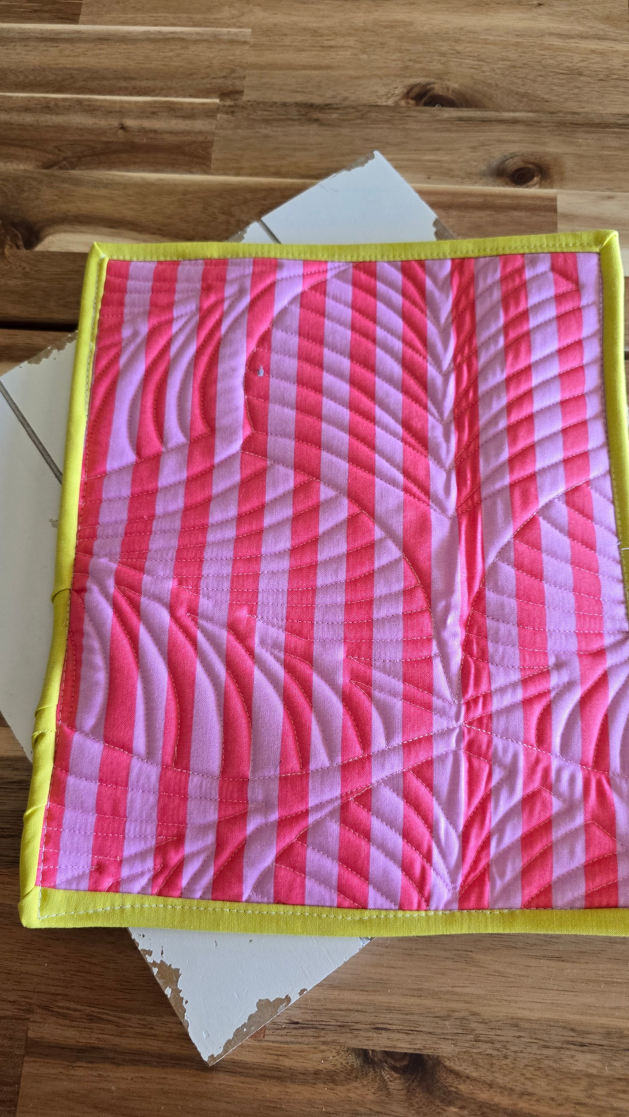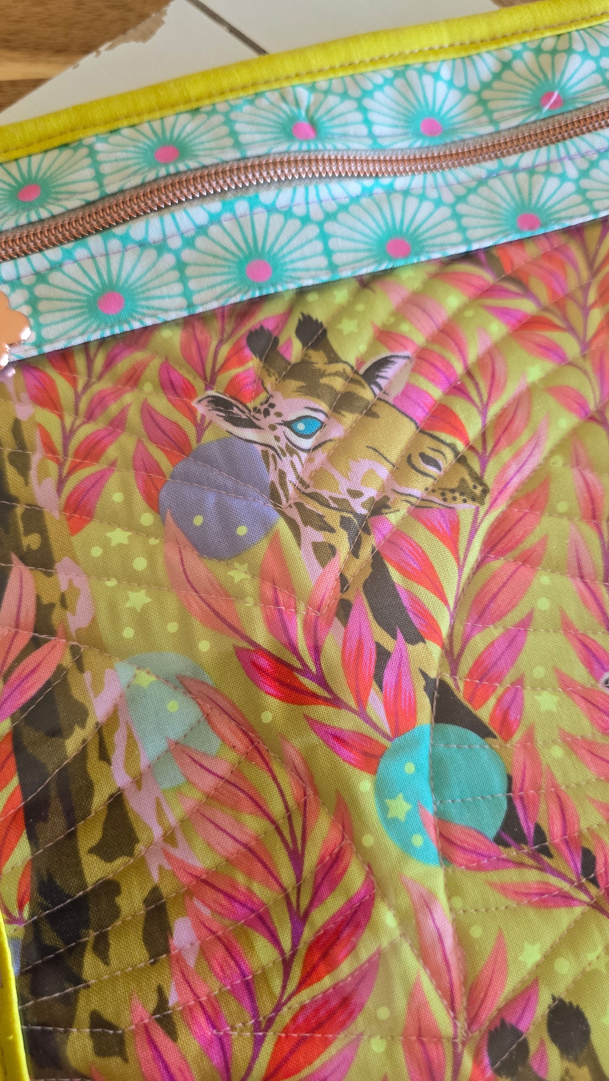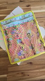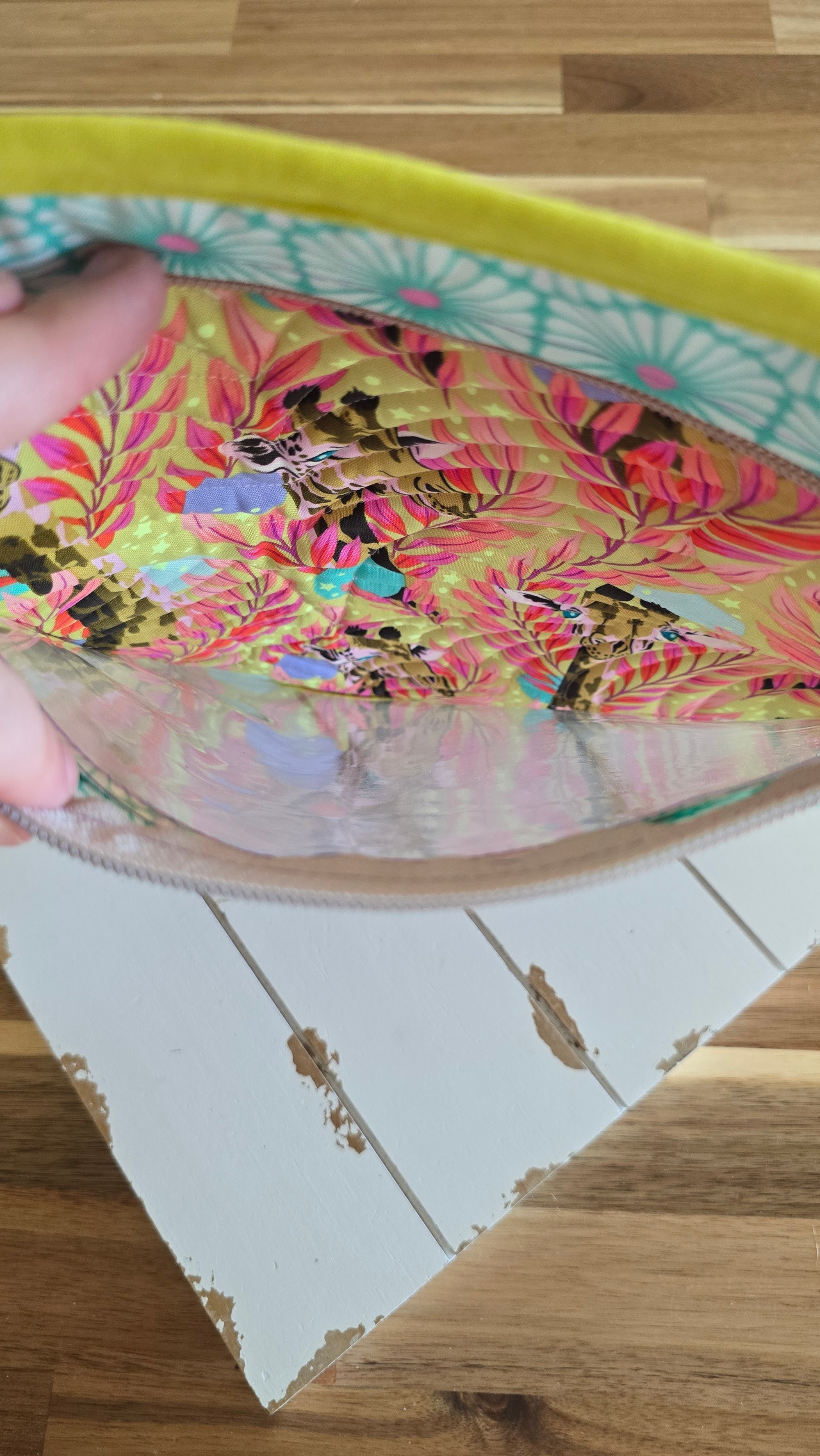 This project bag measures approximately 12x12 and features a vinyl front panel so you can see what is stored inside. Please note there was an issue with the binding near the bottom corner and some puckering is present. This is cosmetic, but has resulted in a lower price.
