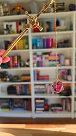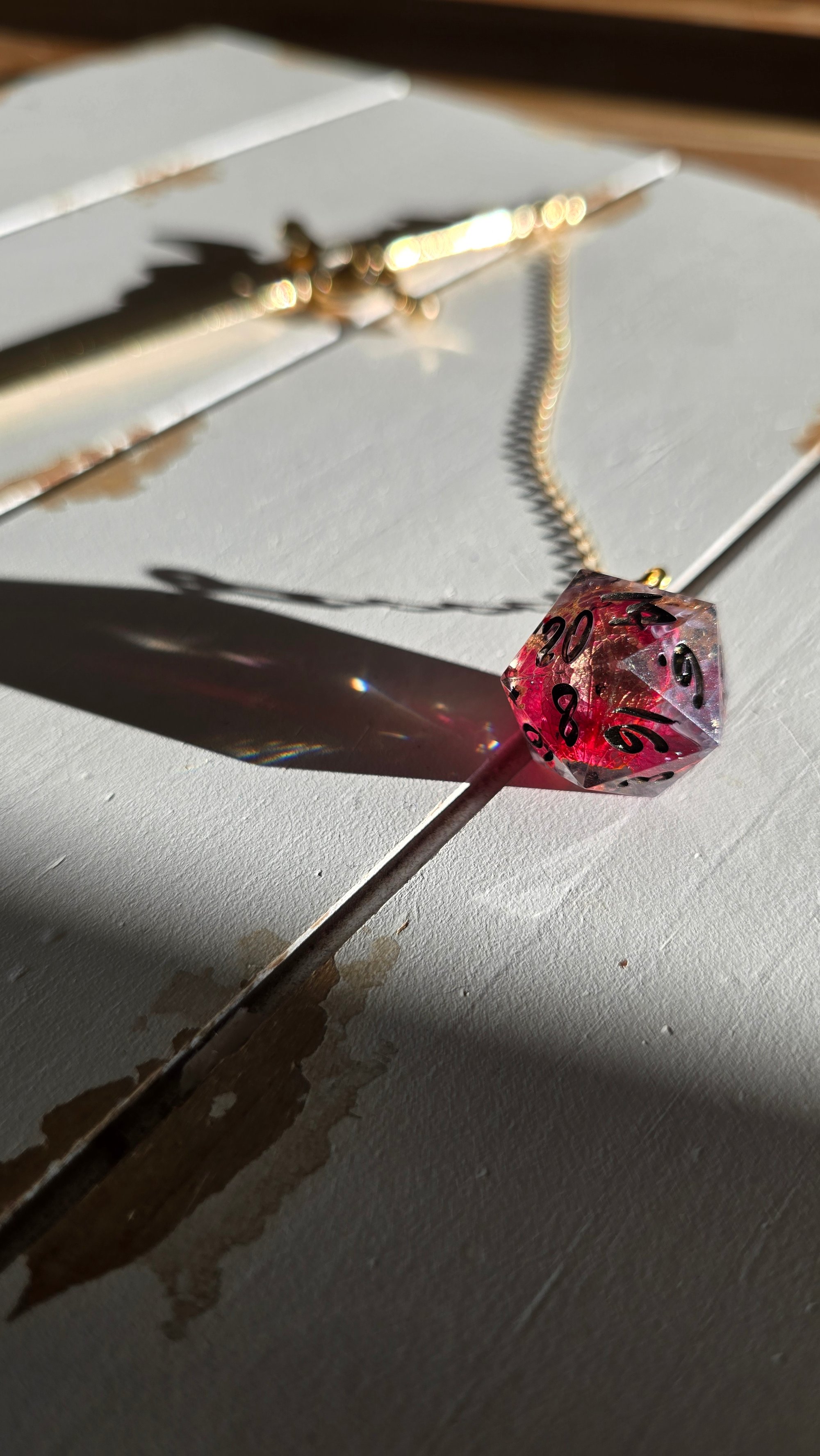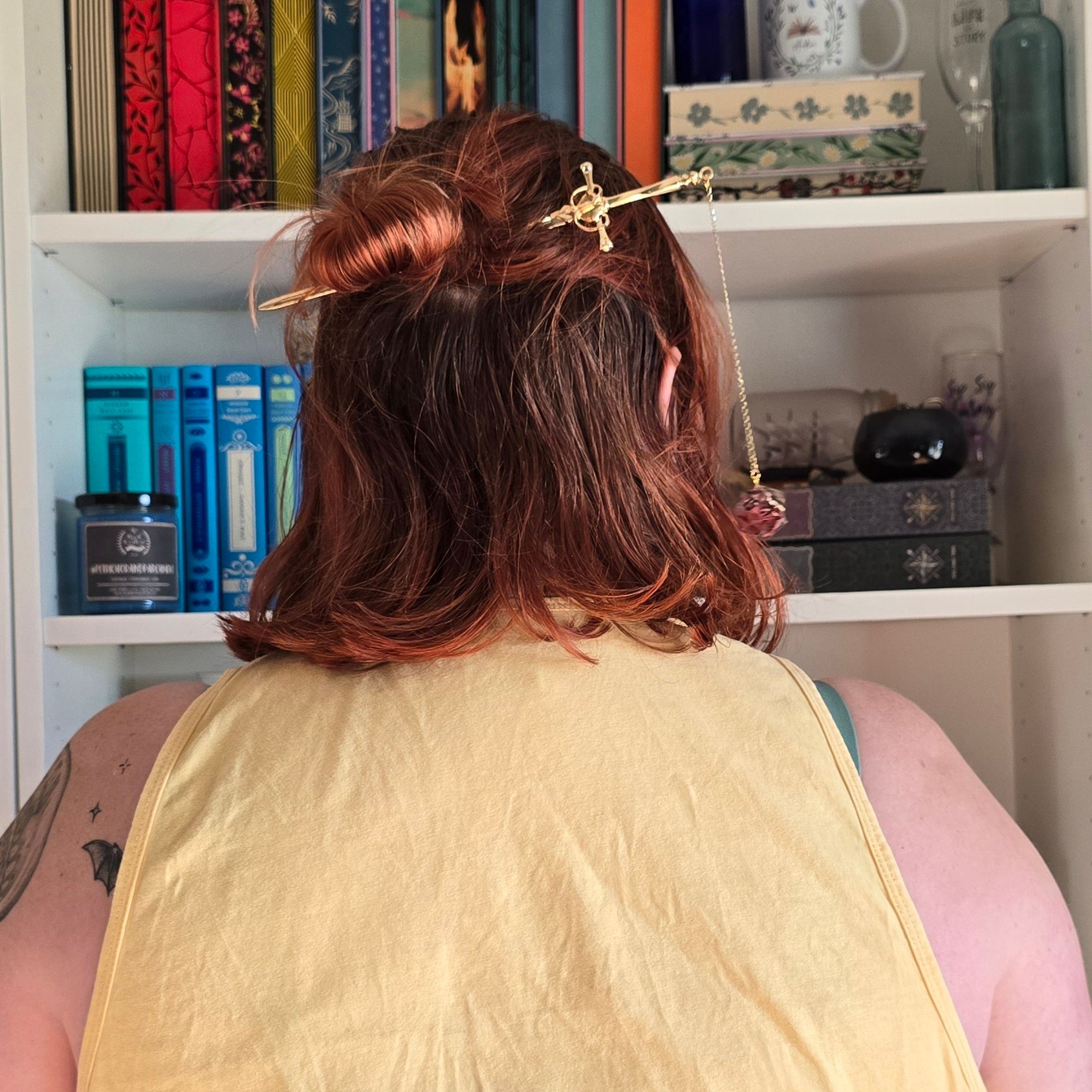 A hadestown inspired d20 paired with a gold sword hairstick.